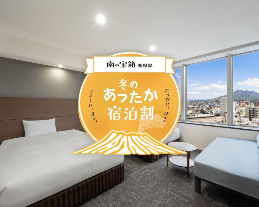 「冬のあったか宿泊割キャンペーン」は、最大20%OFFで利用できる! 公開日 2025年12月01日 カテゴリー ご宿泊 当館は、鹿児島県が実施する宿泊割引キャンペーン「【南の宝箱 鹿児島】冬のあったか宿泊割キャンペーン」に参画しております。 県内にお住まいの皆さまはもちろん、国内外からお越しのお客さままでご利用いただける、大変お得なキャンペーンです。この機会に、雄大な自然、美食、温泉など、鹿児島ならではの魅力に触れながら、心地よいご滞在をお楽しみください。 皆さまのお越しを心よりお待ちしております。 詳細 桜島ビューが楽しめる客室予約 宿泊プラン一覧